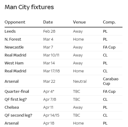 3月7日,曼城將客場(chǎng)對(duì)陣紐卡斯?fàn)?,隨后將在3月10日或11日做客伯納烏。3月14日,曼城客場(chǎng)對(duì)陣西漢姆。3月17日或18日,曼城將在主場(chǎng)對(duì)陣皇馬。3月22日,曼城將在聯(lián)賽杯決賽里對(duì)陣阿森納。